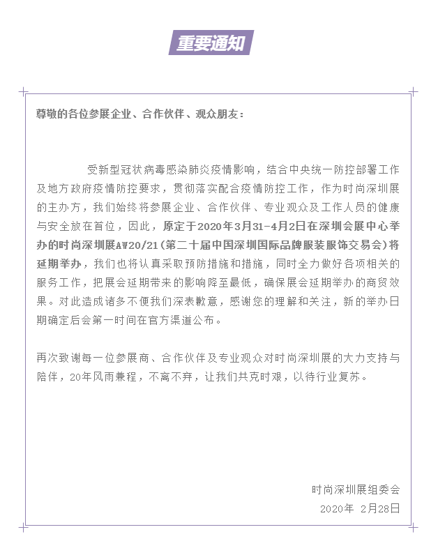 根據(jù)時(shí)尚深圳展設(shè)計(jì)搭建公司領(lǐng)藝展覽了解到,受新型冠狀病毒感染肺炎疫情影響,結(jié)合中央統(tǒng)一防控部署工作及地方政府疫情防控要求,貫徹落實(shí)配合疫情防控工作,作為時(shí)尚深圳展的主辦方,我們始終將參展企業(yè)、合作伙伴、專業(yè)觀眾及工作人員的健康與安全放在首位,因此,原定于2020年3月31-4月2日在深圳會(huì)展中心舉辦的時(shí)尚深圳展AW20/21(第二十屆中國深圳國際品牌服裝服飾交易會(huì))將延期舉辦,我們也將認(rèn)真采取預(yù)防措施和措施,同時(shí)全力做好各項(xiàng)相關(guān)的服務(wù)工作,把展會(huì)延期帶來的影響降至最低,確保展會(huì)延期舉辦的商貿(mào)效果。對(duì)此造成諸多不便我們深表歉意,感謝您的理解和關(guān)注,新的舉辦日期確定后會(huì)第一時(shí)間在官方渠道公布。如需時(shí)尚深圳展設(shè)計(jì)請(qǐng)聯(lián)系領(lǐng)藝展覽,希望我們能在時(shí)尚深圳展搭建上為您添磚加瓦,祝各位朋友收獲多多,滿載而歸!