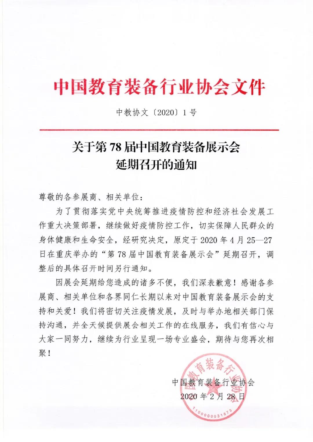 根據(jù)教育展設(shè)計搭建公司領(lǐng)藝展覽了解到,為了貫徹落實黨中央統(tǒng)籌推進疫情防控和經(jīng)濟社會發(fā)展工作重大決策部署,繼續(xù)做好疫情防控工作,切實保障人民群眾的身體健康和生命安全,經(jīng)研究決定,原定于2020年4月25—27日在重慶舉辦的“第78屆中國教育裝備展示會”延期召開,調(diào)整后的具體召開時間另行通知。如需教育展設(shè)計請聯(lián)系領(lǐng)藝展覽,希望我們能在教育展搭建上為您添磚加瓦,祝各位朋友收獲多多,滿載而歸!