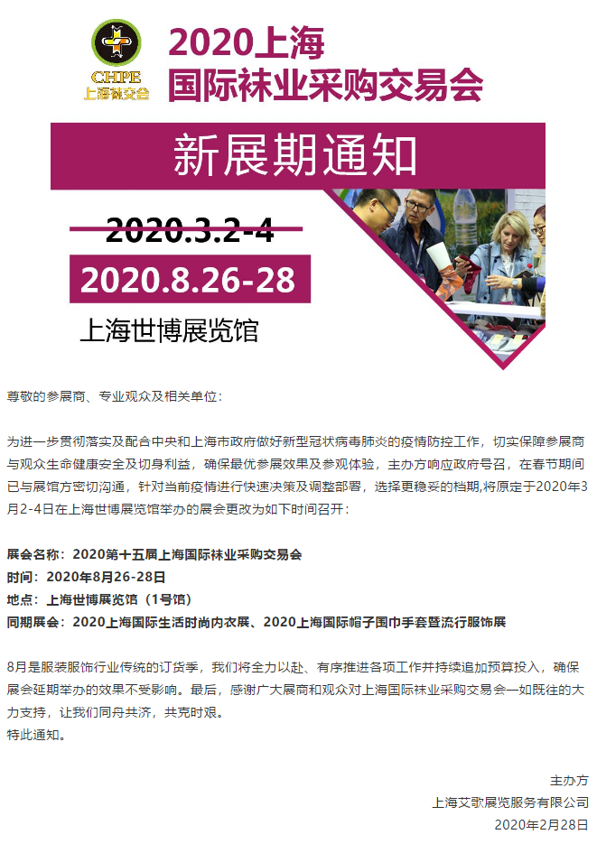 根據(jù)襪交會展臺設(shè)計公司領(lǐng)藝展覽了解到,為進(jìn)一步貫徹落實(shí)及配合中央和上海市政府做好新型冠狀病毒肺炎的疫情防控工作,切實(shí)保障參展商與觀眾生命健康安全及切身利益,確保最優(yōu)參展效果及參觀體驗(yàn),主辦方響應(yīng)政府號召,在春節(jié)期間已與展館方密切溝通,針對當(dāng)前疫情進(jìn)行快速決策及調(diào)整部署,選擇更穩(wěn)妥的檔期,將原定于2020年3月2-4日在上海世博展覽館舉辦的展會更改為8月26-28日召開,如需襪交會展位設(shè)計裝修請聯(lián)系領(lǐng)藝展覽,希望我們能在襪交會布展搭建上為您添磚加瓦,祝各位朋友收獲多多,滿載而歸!