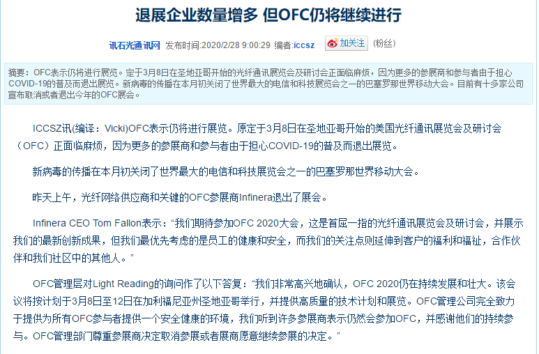 根據(jù)光纖通訊展設(shè)計搭建公司領(lǐng)藝展覽了解到,Infinera CEO Tom Fallon表示:“我們期待參加OFC 2020大會,這是首屈一指的光網(wǎng)絡(luò)會議,并展示我們的最新創(chuàng)新成果,但我們最優(yōu)先考慮的是員工的健康和安全,而我們的關(guān)注點則延伸到客戶的福利和福祉,合作伙伴和我們社區(qū)中的其他人。”O(jiān)FC管理層對Light Reading的詢問作了以下答復(fù):“我們非常高興地確認,OFC 2020仍在持續(xù)發(fā)展和壯大。該會議將按計劃于3月8日至12日在加利福尼亞州圣地亞哥舉行,并提供高質(zhì)量的技術(shù)計劃和展覽。OFC管理公司完全致力于提供為所有OFC參與者提供一個安全健康的環(huán)境,我們聽到許多參展商表示仍然會參加OFC,并感謝他們的持續(xù)參與。OFC管理部門尊重參展商決定取消參展并愿意合作的決定。”如需光纖通訊展設(shè)計請聯(lián)系領(lǐng)藝展覽,希望我們能在光纖通訊展搭建上為您添磚加瓦,祝各位朋友收獲多多,滿載而歸!