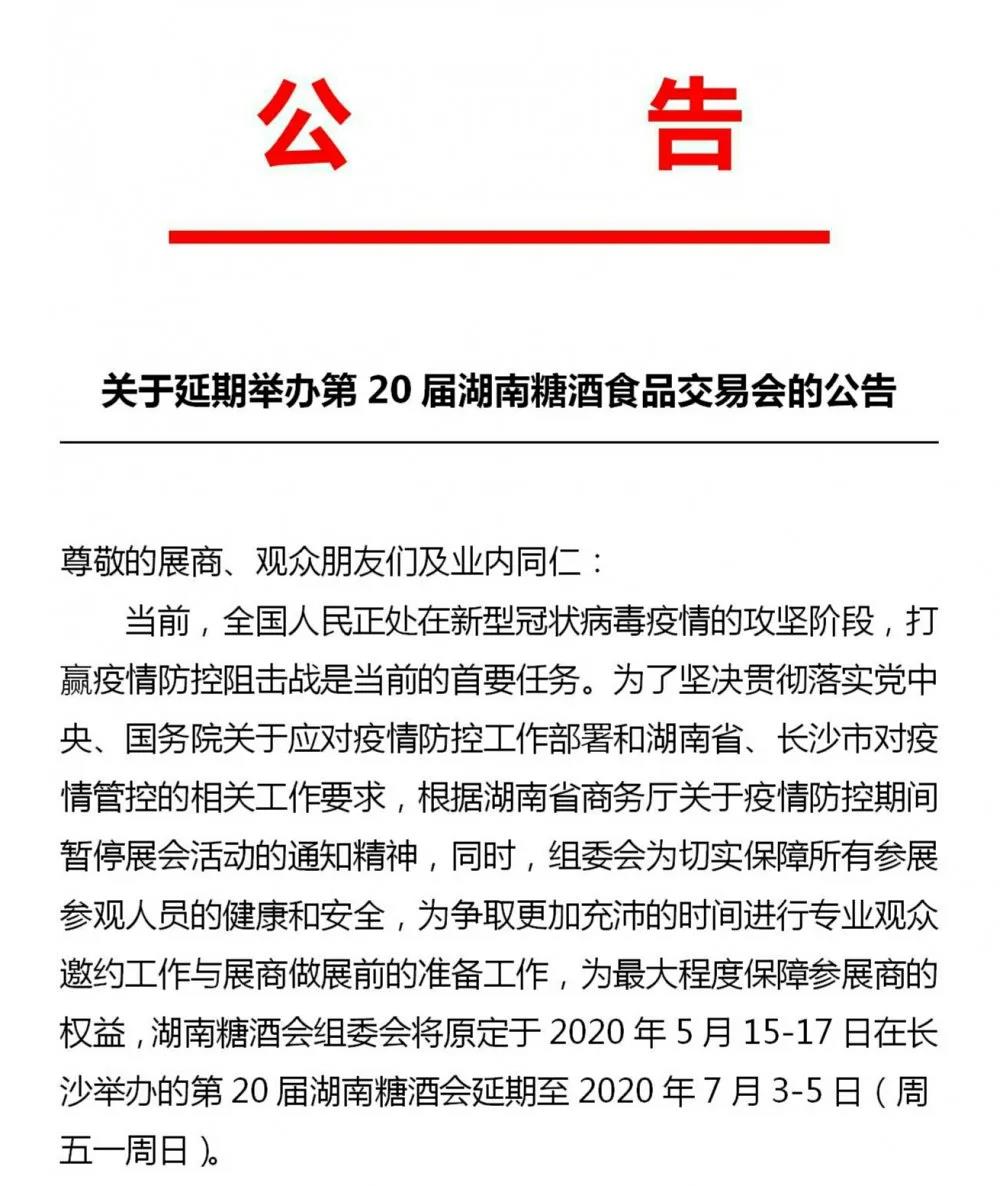根據(jù)湖南糖酒會設(shè)計搭建公司領(lǐng)藝展覽了解到,受新型冠狀病毒肺炎疫情影響,原定于2020年5月15-17日在長沙舉辦的第二十屆湖南糖酒食品交易會延期至2020年7月3-5日舉行。如需湖南糖酒會設(shè)計請聯(lián)系領(lǐng)藝展覽,希望我們能在湖南糖酒會搭建上為您添磚加瓦,祝各位朋友收獲多多,滿載而歸!