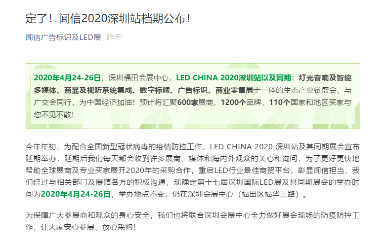 根據(jù)深圳LED展設(shè)計(jì)搭建公司領(lǐng)藝展覽了解到,現(xiàn)確定第十七屆深圳國(guó)際LED展及其同期展會(huì)的舉辦時(shí)間為2020年4月24-26日,舉辦地點(diǎn)不變,仍在深圳會(huì)展中心(福田區(qū)福華三路)。如需深圳LED展設(shè)計(jì)請(qǐng)聯(lián)系領(lǐng)藝展覽,希望我們能在深圳LED展搭建上為您添磚加瓦,祝各位朋友收獲多多,滿載而歸!