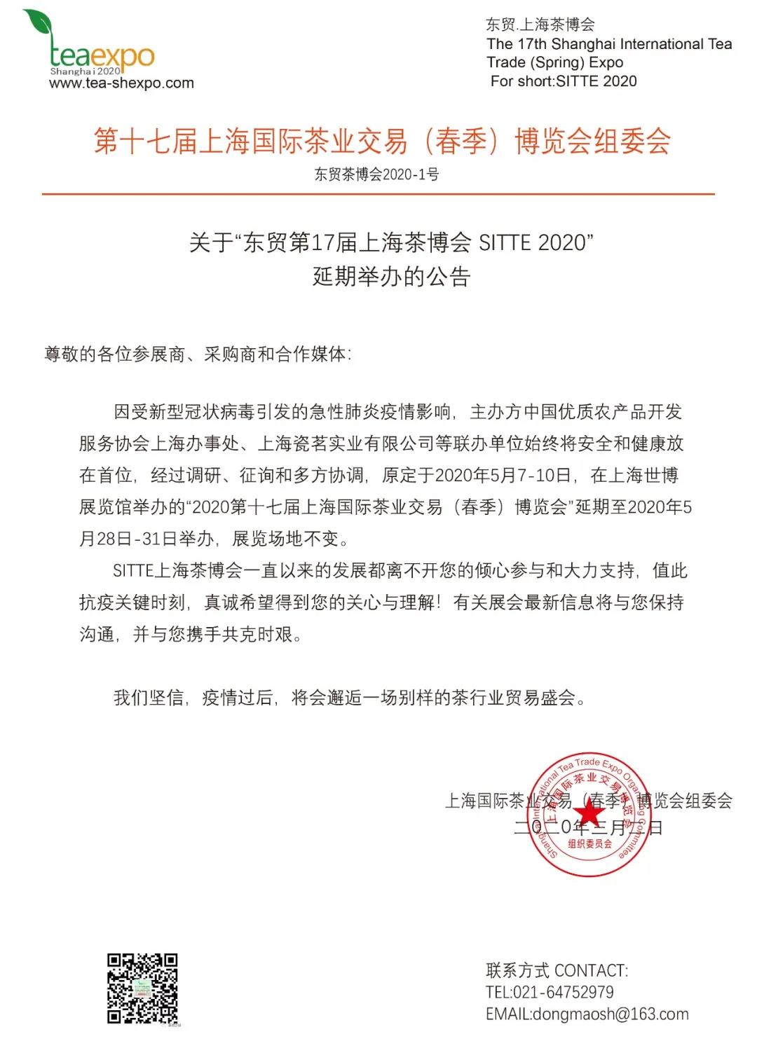 根據(jù)上海春季茶博會(huì)設(shè)計(jì)搭建公司領(lǐng)藝展覽了解到,因受新型冠狀病毒肺炎疫情的影響,原定于2020年5月7-10日,在上海世博展覽館舉辦的“2020第十七屆上海國(guó)際茶業(yè)交易(春季)博覽會(huì)”延期至2020年5月28-31日舉辦,展覽場(chǎng)地不變。如需上海茶博會(huì)設(shè)計(jì)請(qǐng)聯(lián)系領(lǐng)藝展覽,希望我們能在上海茶博會(huì)搭建上為您添磚加瓦,祝各位朋友收獲多多,滿載而歸!