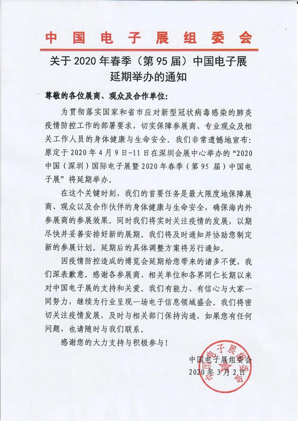根據(jù)深圳電子展設(shè)計(jì)搭建公司領(lǐng)藝展覽了解到,原定于2020年4月9-11日在深圳會(huì)展中心舉辦的第95屆中國電子展延期,延期后的具體調(diào)整方案將另行通知。如需深圳電子展設(shè)計(jì)請(qǐng)聯(lián)系領(lǐng)藝展覽,希望我們能在深圳電子展搭建上為您添磚加瓦,祝各位朋友收獲多多,滿載而歸!