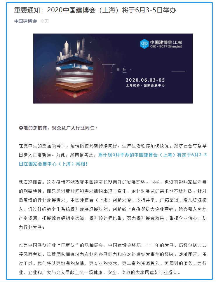 根據(jù)上海建博會設(shè)計搭建公司領(lǐng)藝展覽了解到,原計劃3月舉辦的中國建博會(上海)將定于6月3-5日在國家會展中心(上海)亮相!全力為行業(yè)奉獻一場保障安全、富有成效、占得先機的采購貿(mào)易盛會!如需上海建博會設(shè)計請聯(lián)系領(lǐng)藝展覽,希望我們能在上海建博會搭建上為您添磚加瓦,祝各位朋友收獲多多,滿載而歸!