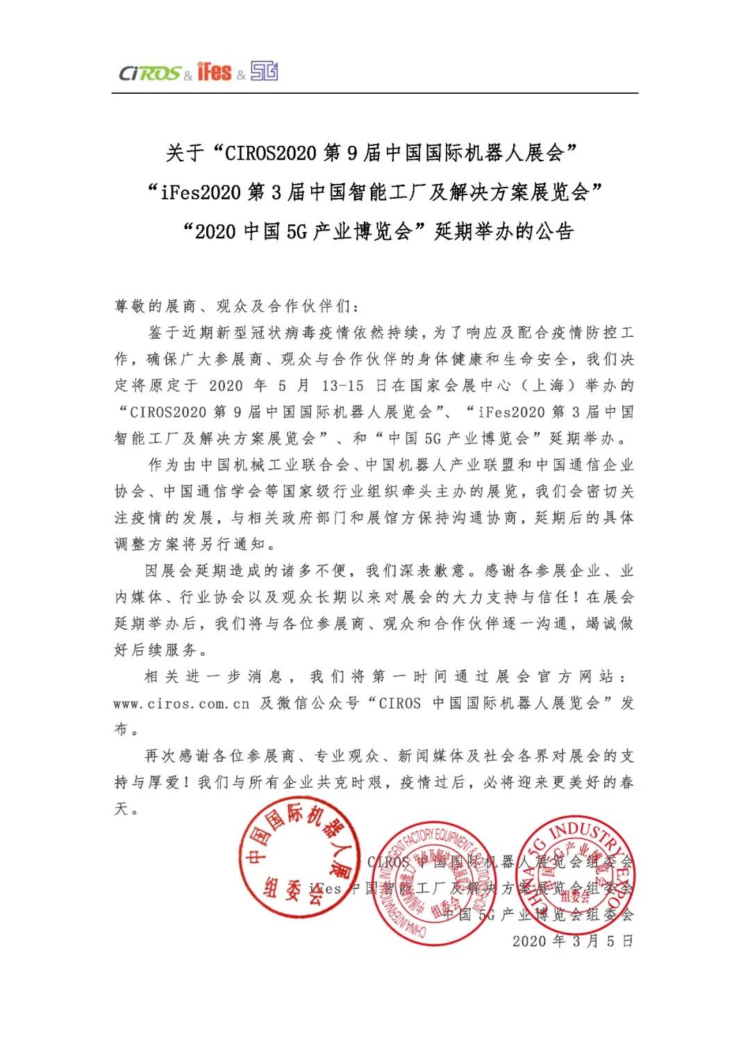 根據(jù)上海展臺設(shè)計搭建公司領(lǐng)藝展覽了解到原定于2020年5月13-15日在國家會展中心(上海)舉辦的“CIROS2020第9屆中國國際機器人展覽會”、“iFes2020第3屆中國智能工廠及解決方案展覽會”和“中國5G產(chǎn)業(yè)博覽會”延期舉辦。如需上海展臺設(shè)計請聯(lián)系領(lǐng)藝展覽,希望我們能在上海展臺搭建上為您添磚加瓦,祝各位朋友收獲多多,滿載而歸!