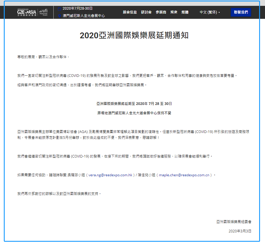 根據(jù)娛樂展設(shè)計(jì)搭建公司領(lǐng)藝展覽了解到,受新冠肺炎疫情的影響。亞洲國際娛樂展將延期至 2020年 7月 28 至 30日,原場地澳門威尼斯人金光大道會展中心保持不變。如需娛樂展設(shè)計(jì)請聯(lián)系領(lǐng)藝展覽,希望我們能在澳門展臺展搭建上為您添磚加瓦,祝各位朋友收獲多多,滿載而歸!