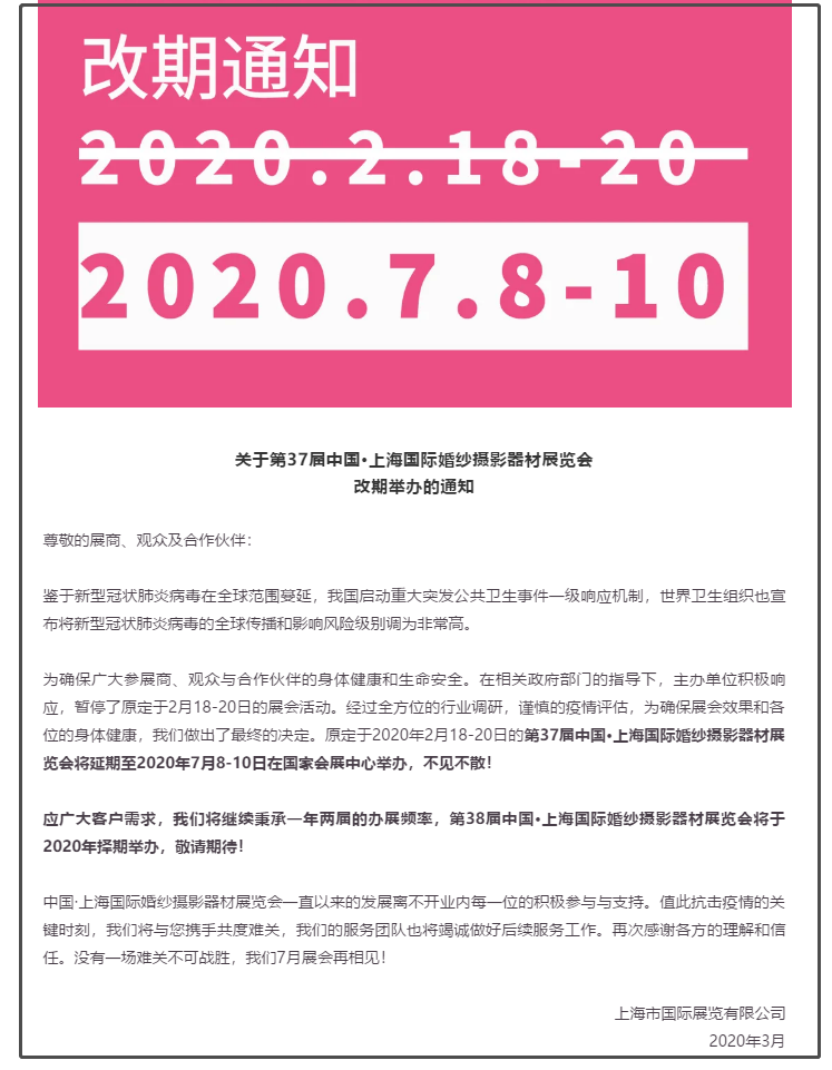 根據上海展臺設計搭建公司領藝展覽了解到,原定于2020年2月18-20日的第37屆中國·上海國際婚紗攝影器材展覽會將延期至2020年7月8-10日在國家會展中心舉辦。如需上海展臺設計請聯系領藝展覽,希望我們能在上海展臺搭建上為您添磚加瓦,祝各位朋友收獲多多,滿載而歸!