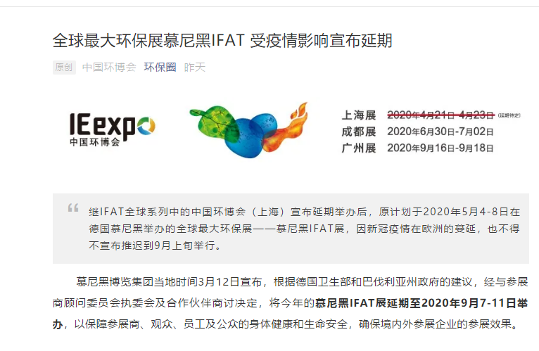 根據環保展設計搭建公司領藝展覽了解到,慕尼黑博覽集團當地時間3月12日宣布,根據德國衛生部和巴伐利亞州政府的建議,經與參展商顧問委員會執委會及合作伙伴商討決定,將今年的慕尼黑IFAT展延期至2020年9月7-11日舉辦,以保障參展商、觀眾、員工及公眾的身體健康和生命安全,確保境內外參展企業的參展效果。如需環保展設計請聯系領藝展覽,希望我們能在環保展搭建上為您添磚加瓦,祝各位朋友收獲多多,滿載而歸!
