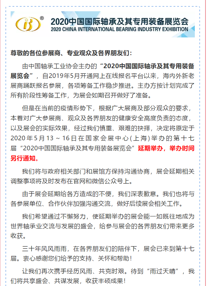 根據軸承展設計搭建公司領藝展覽了解到,原定于2020年5月13~16日在國家會展中心(上海)舉辦的第十七屆“2020中國國際軸承及其專用裝備展覽會”延期舉辦,舉辦時間另行通知。如需軸承展設計請聯系領藝展覽,希望我們能在軸承展搭建上為您添磚加瓦,祝各位朋友收獲多多,滿載而歸!