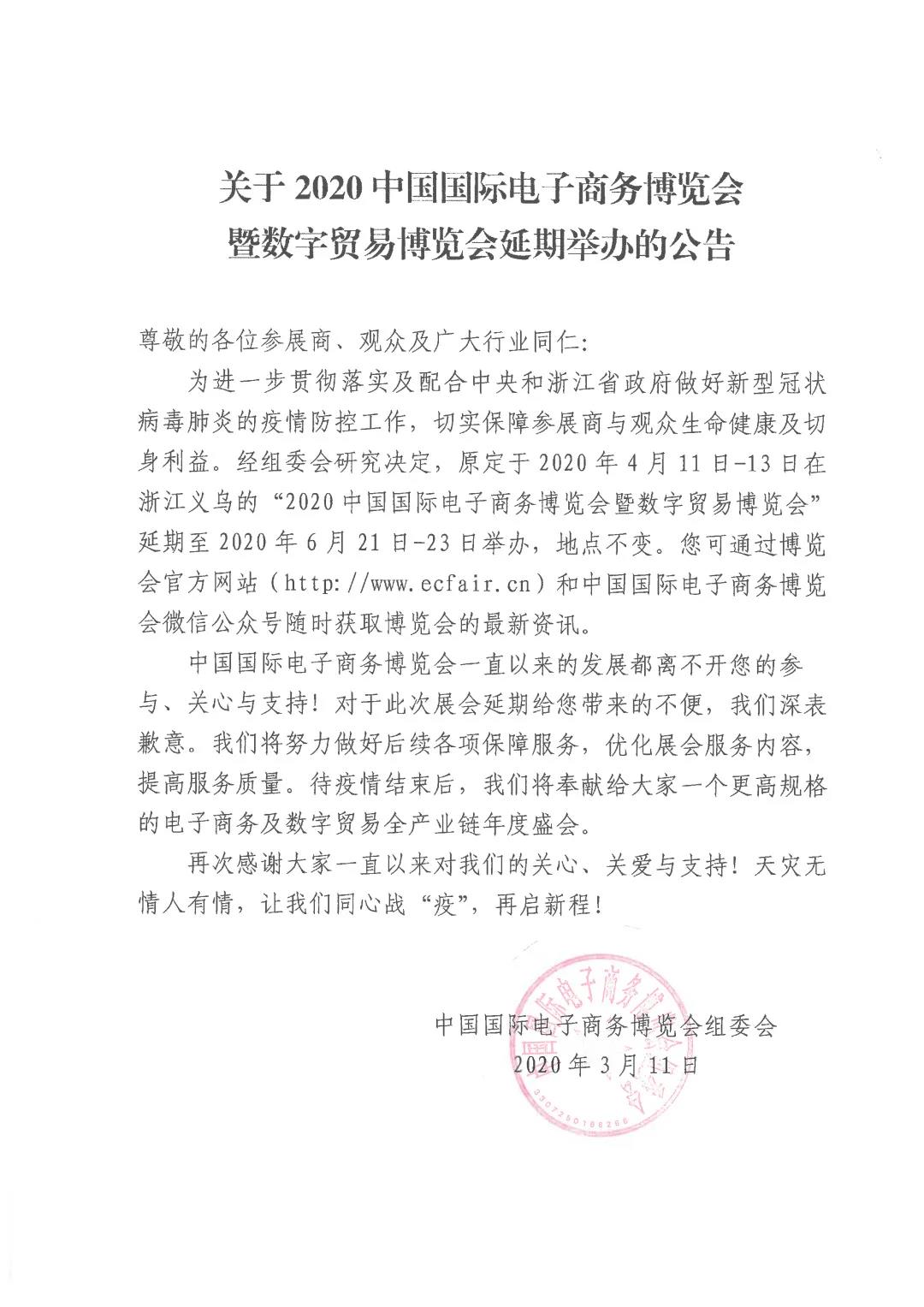 根據義烏展臺設計搭建公司領藝展覽了解到,原定于“2020年4月11-13日”在義烏國際博覽中心舉辦的“2020中國國際電子商務博覽會及數字貿易博覽會”延期至2020年6月21-23日舉辦,地點不變。如需電商博覽會設計請聯系領藝展覽,希望我們能在電商博覽會搭建上為您添磚加瓦,祝各位朋友收獲多多,滿載而歸!
