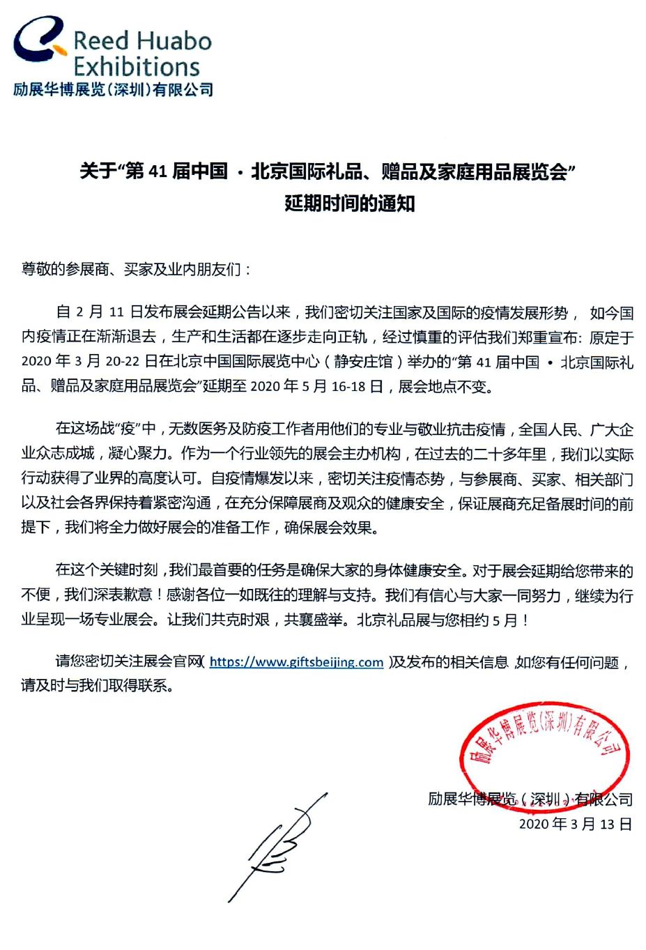 根據禮品展設計搭建公司領藝展覽了解到,原定于2020年3月20-22日在北京中國國際展覽中心(靜安莊館)舉辦的“第41屆中國?北京國際禮品、贈品及家庭用品展覽會” 延期至2020年5月16-18日,展會地點不變。如需禮品展設計請聯系領藝展覽,希望我們能在禮品展搭建上為您添磚加瓦,祝各位朋友收獲多多,滿載而歸!