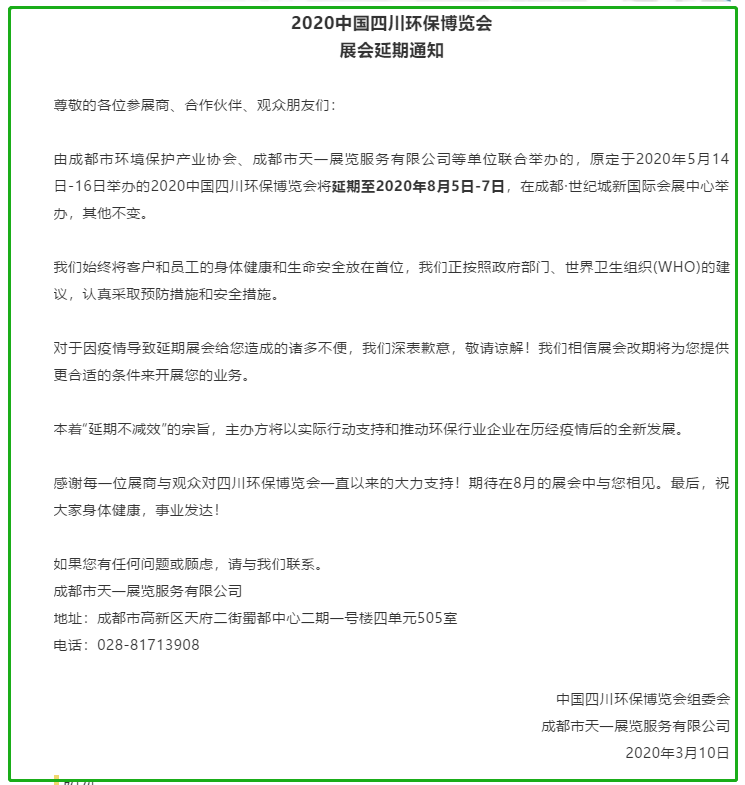 根據環保展設計搭建公司領藝展覽了解到,原定于2020年5月14日-16日舉辦的2020中國四川環保博覽會將延期至2020年8月5日-7日,在成都·世紀城新國際會展中心舉辦,其他不變。 如需環保展設計請聯系領藝展覽,希望我們能在環保展搭建上為您添磚加瓦,祝各位朋友收獲多多,滿載而歸!