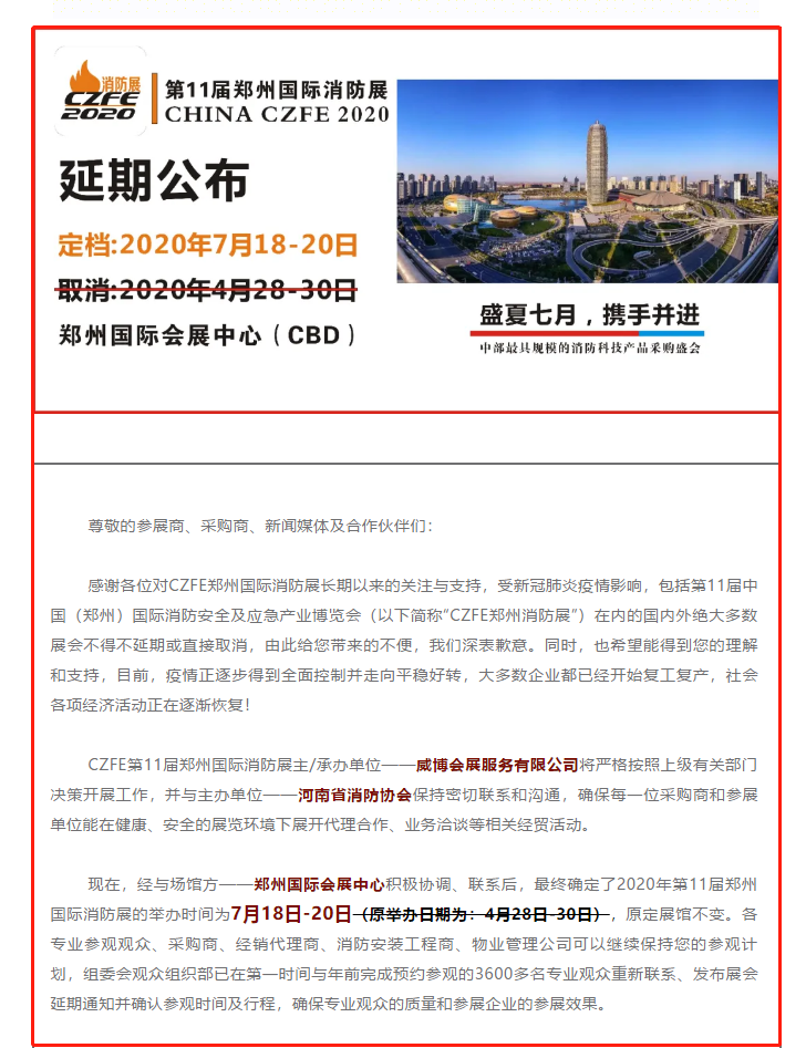 根據消防展設計搭建公司領藝展覽了解到,經與場館方——鄭州國際會展中心積極協調、聯系后,主辦最終確定了2020年第11屆鄭州國際消防展的舉辦時間為7月18日-20日(原舉辦日期為:4月28日-30日),原定展館不變。如需消防展設計請聯系領藝展覽,希望我們能在消防展搭建上為您添磚加瓦,祝各位朋友收獲多多,滿載而歸!