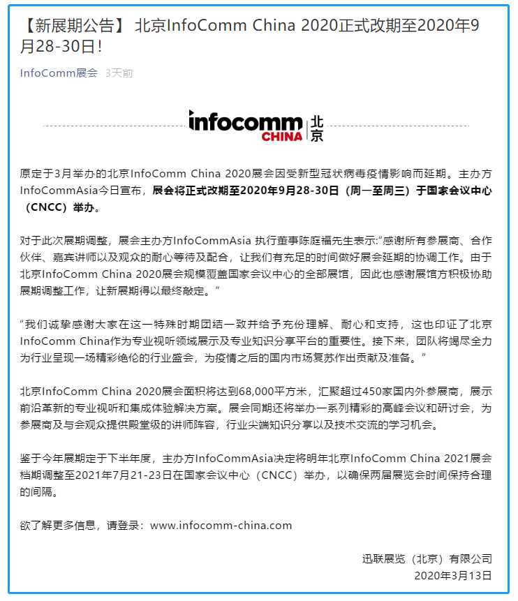 根據北京展會設計搭建公司領藝展覽了解到,原定于3月舉辦的北京InfoComm China 2020展會因受新型冠狀病毒疫情影響而延期。主辦方InfoCommAsia今日宣布,展會將正式改期至2020年9月28-30日(周一至周三)于國家會議中心(CNCC)舉辦。如需北京展會設計請聯系領藝展覽,希望我們能在北京展會搭建上為您添磚加瓦,祝各位朋友收獲多多,滿載而歸!