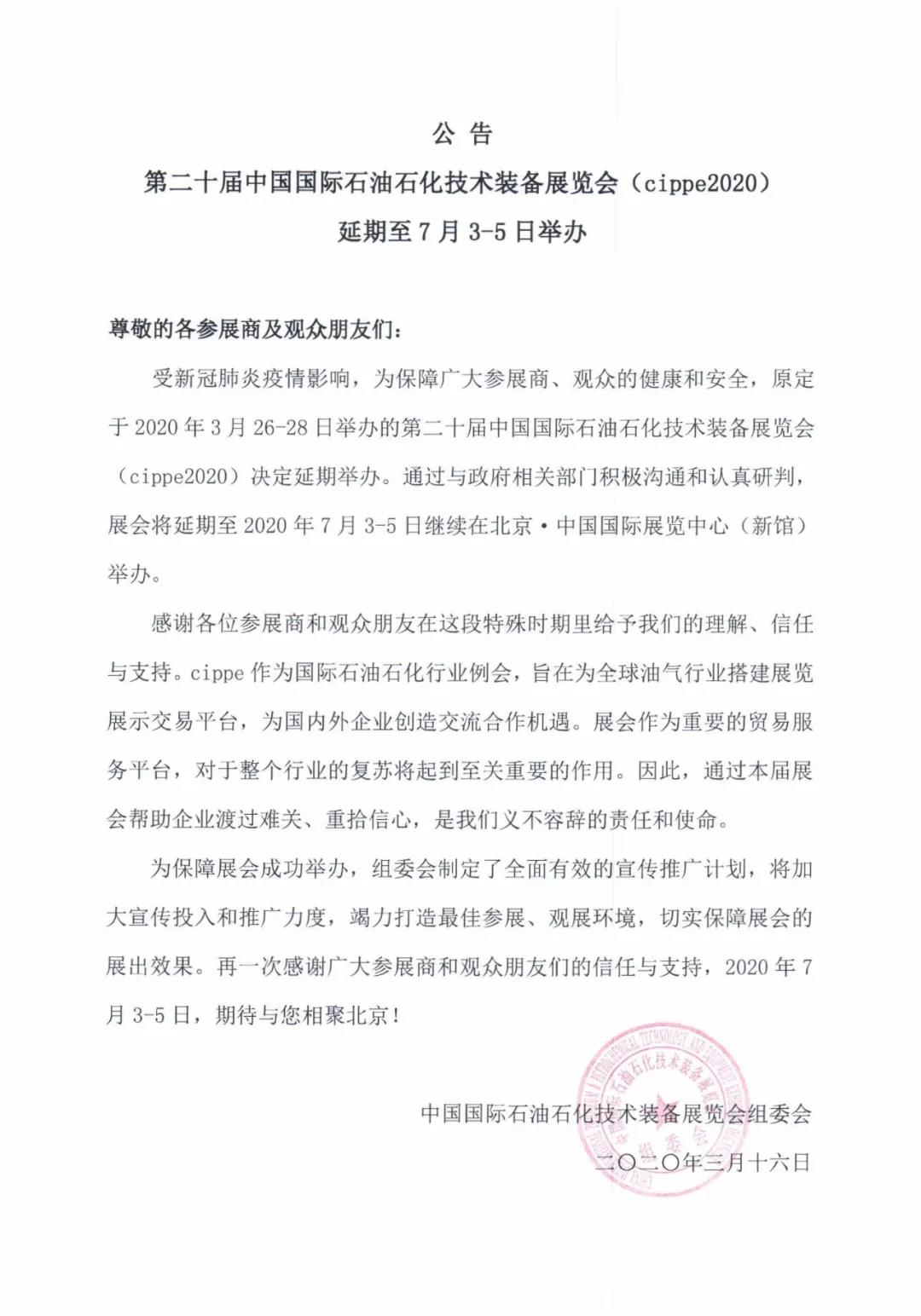 根據北京石油展設計搭建公司領藝展覽了解到原定于2020年3月26-28日舉辦的第二十屆中國國際石油石化技術裝備展覽會(cippe2020),將延期至7月3日至5日在北京·中國國際展覽中心(新館)舉行,歡迎您屆時參展參觀。如需北京石油展展會設計請聯系領藝展覽,希望我們能在北京石油展搭建上為您添磚加瓦,祝各位朋友收獲多多,滿載而歸!