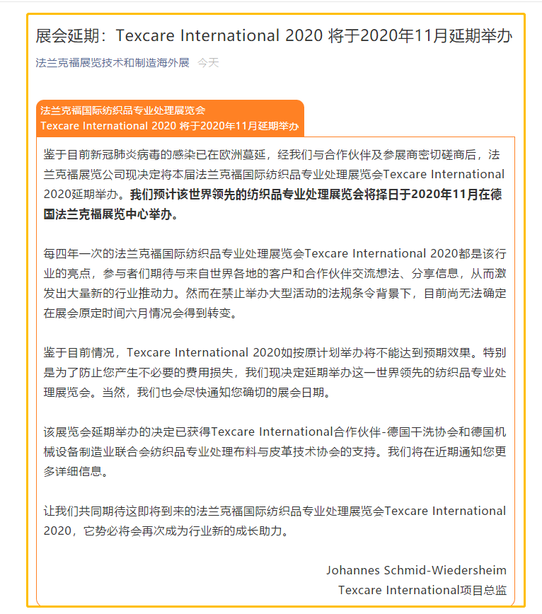 根據紡織展展會設計搭建公司領藝展覽了解到,鑒于目前新冠肺炎病毒的感染已在歐洲蔓延,經我們與合作伙伴及參展商密切磋商后,法蘭克福展覽公司現決定將本屆法蘭克福國際紡織品專業處理展覽會Texcare International 2020延期舉辦。我們預計該世界領先的紡織品專業處理展覽會將擇日于2020年11月在德國法蘭克福展覽中心舉辦。如需紡織展設計請聯系領藝展覽,希望我們能在紡織展搭建上為您添磚加瓦,祝各位朋友收獲多多,滿載而歸!