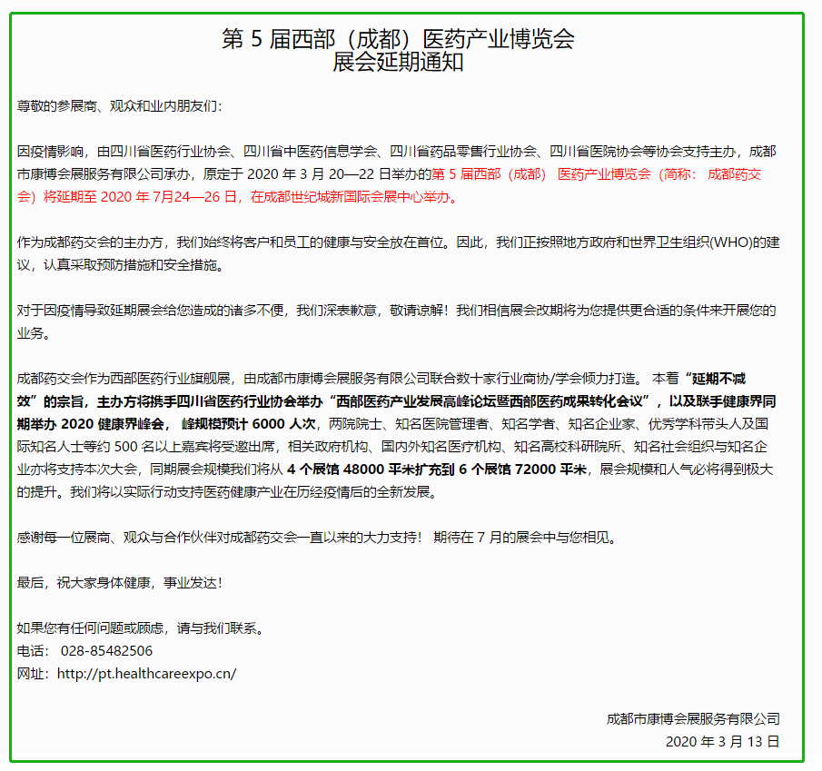 根據成都展臺搭建公司領藝展覽了解到,原定于 2020 年 3 月 20—22 日舉辦的第 5 屆西部(成都) 醫藥產業博覽會(簡稱: 成都藥交會)將延期至 2020 年 7月24—26 日,在成都世紀城新國際會展中心舉辦。如需成都展會設計請聯系領藝展覽,希望我們能在成都展會搭建上為您添磚加瓦,祝各位朋友收獲多多,滿載而歸!