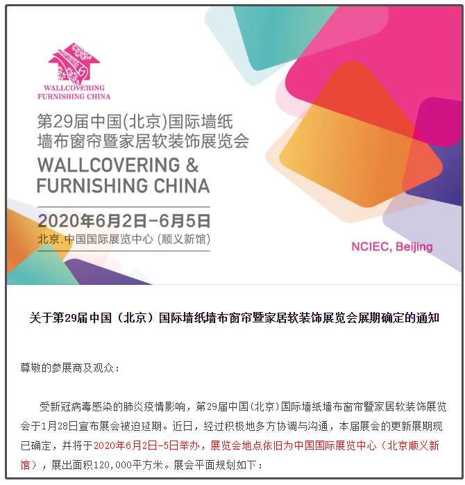 根據北京展會設計搭建公司領藝展覽了解到,受新冠病毒感染的肺炎疫情影響,第29屆中國(北京)國際墻紙墻布窗簾暨家居軟裝飾展覽會于1月28日宣布展會被迫延期。近日,經過積極地多方協調與溝通,本屆展會的更新展期現已確定,并將于2020年6月2日-5日舉辦,展覽會地點依舊為中國國際展覽中心(北京順義新館),展出面積120,000平方米。如需北京展會設計請聯系領藝展覽,希望我們能在北京展會搭建上為您添磚加瓦,祝各位朋友收獲多多,滿載而歸!