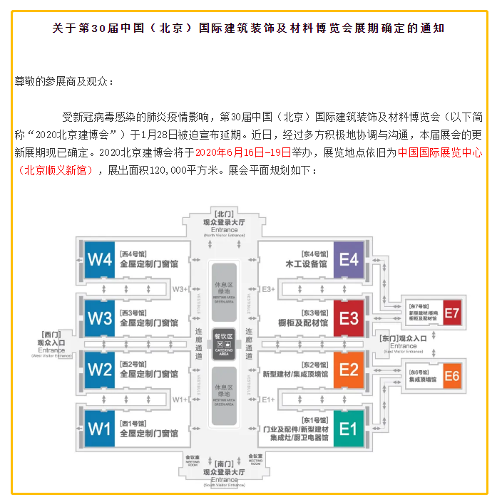 根據北京展會設計搭建公司領藝展覽了解到,受新冠病毒感染的肺炎疫情影響,第30屆中國(北京)國際建筑裝飾及材料博覽會(以下簡稱“2020北京建博會”)于1月28日被迫宣布延期。近日,經過多方積極地協調與溝通,本屆展會的更新展期現已確定。2020北京建博會將于2020年6月16日-19日舉辦,展覽地點依舊為中國國際展覽中心(北京順義新館)。如需北京展會設計請聯系領藝展覽,希望我們能在北京展會搭建上為您添磚加瓦,祝各位朋友收獲多多,滿載而歸!