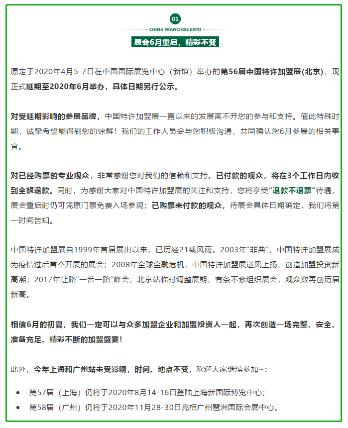 根據北京展會設計搭建公司領藝展覽了解到,原定于2020年4月5-7日在中國國際展覽中心(新館)舉辦的第56屆中國特許加盟展(北京),現正式延期至2020年6月舉辦,具體日期另行公示。如需北京展會設計請聯系領藝展覽,希望我們能在北京展會搭建上為您添磚加瓦,祝各位朋友收獲多多,滿載而歸!