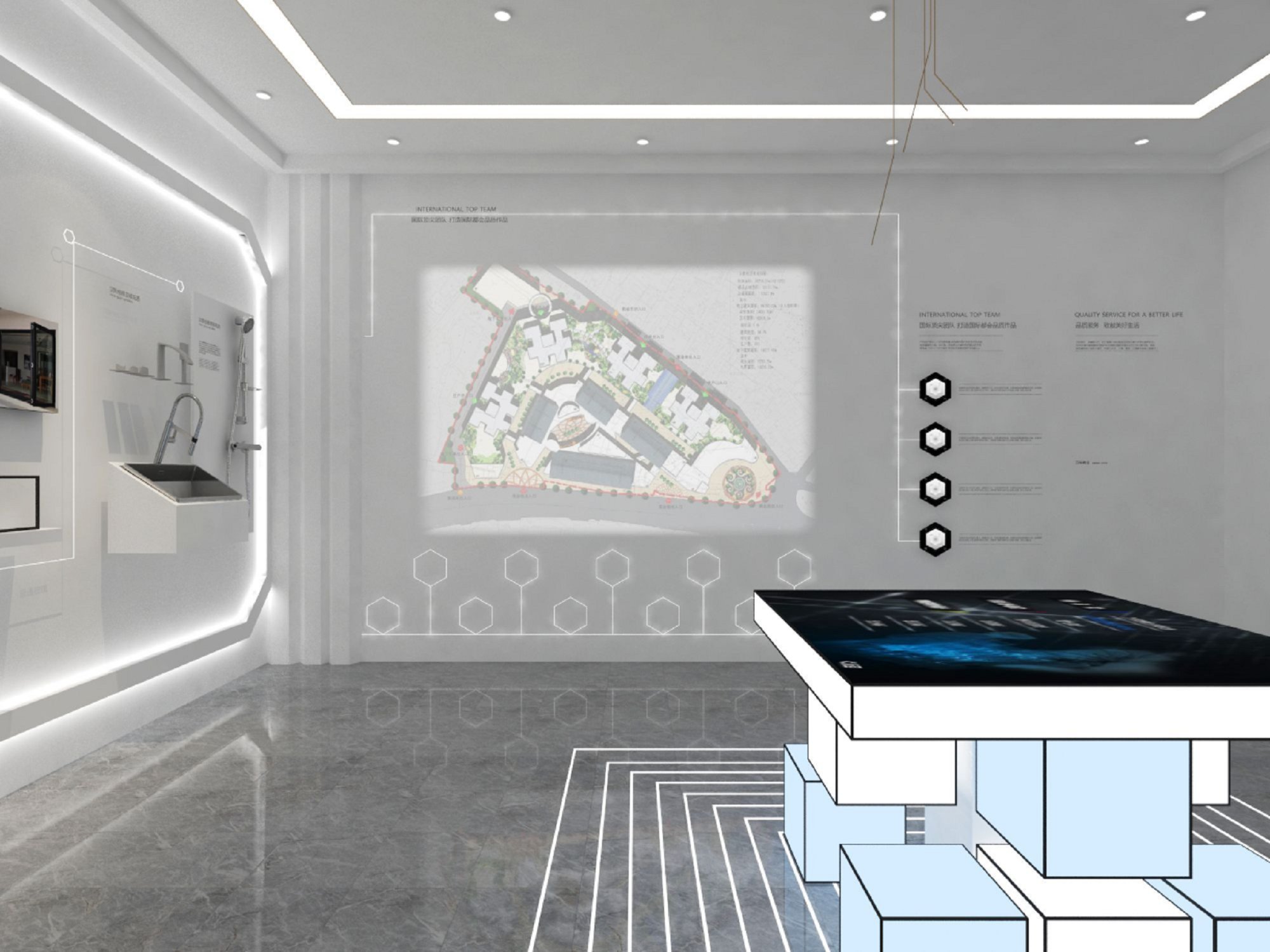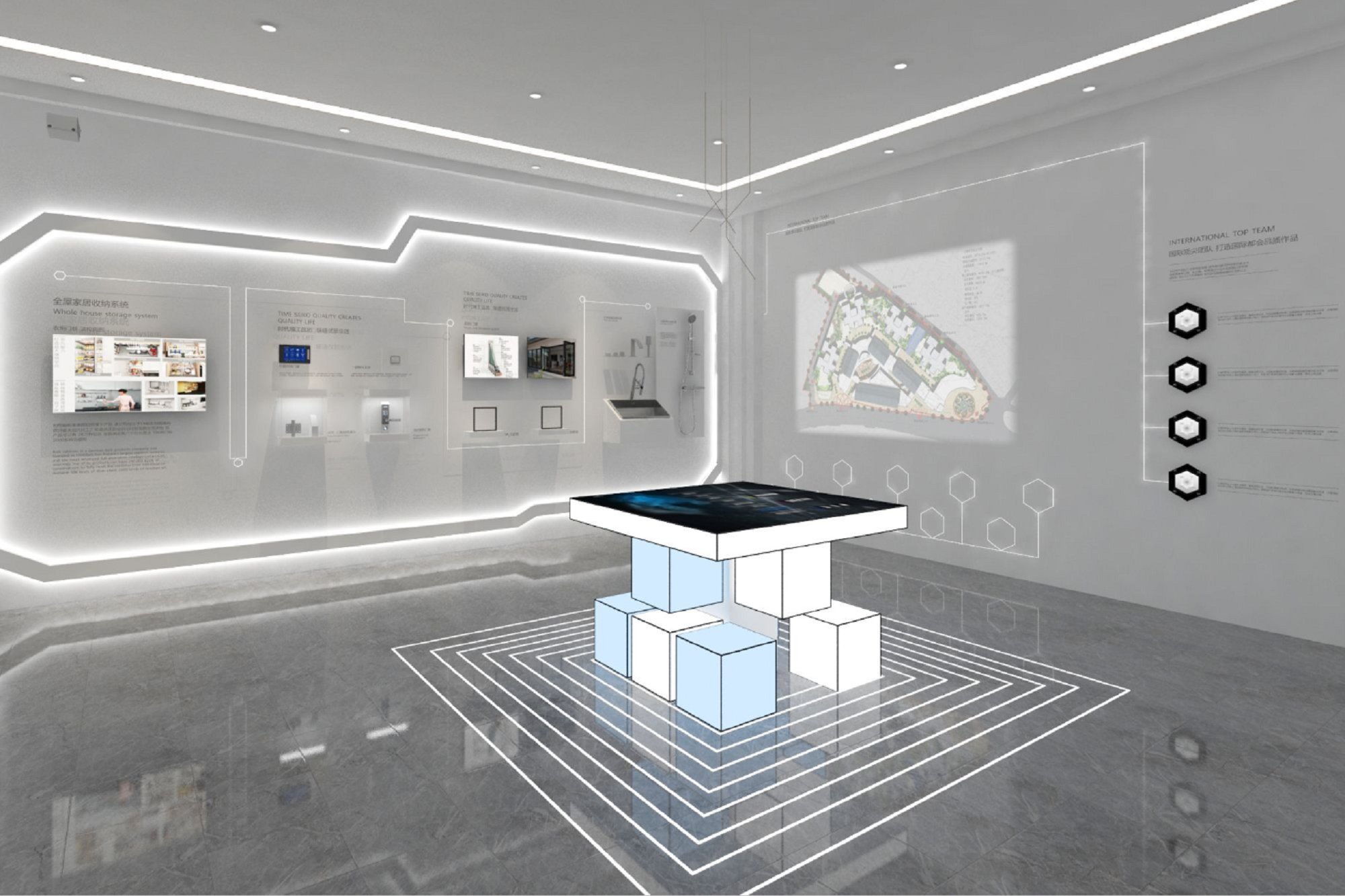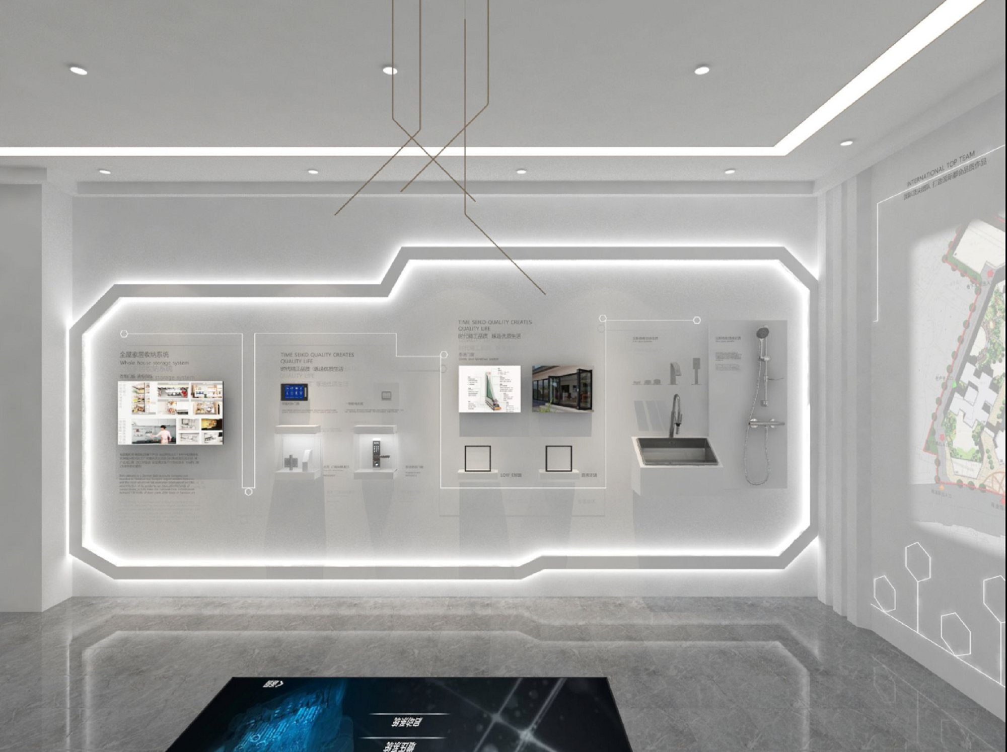契合萬科的品牌形象和產品特性,采用開放式結構進行合理的分區,再搭配燈具燈光的效果,襯托出展廳大氣、豪華的氛圍,突出一種簡約、時尚的品味。