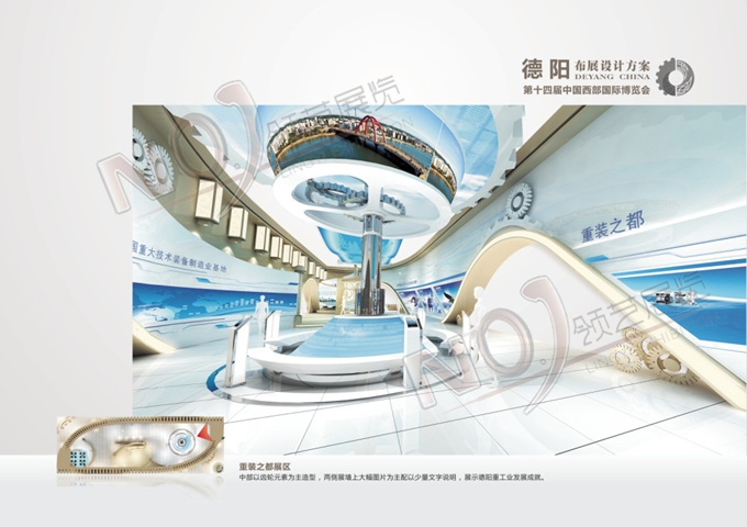 契合德陽地區(qū)的品牌形象和產(chǎn)品特性,以齒輪元素為主造型,中部展區(qū)采用雙通道多媒體視頻循環(huán)播放展示德陽發(fā)展路程的視頻,并配以桌椅可供來賓洽談休息,從中體現(xiàn)德陽人們的建設(shè)百萬人口大城市的成效及夢想。